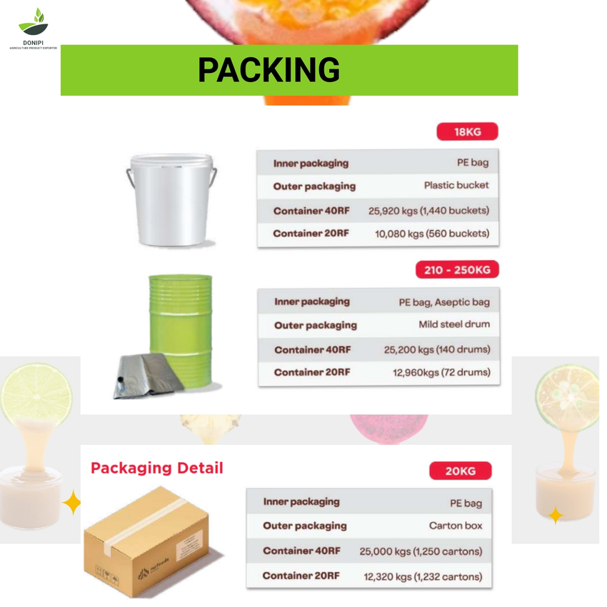 Our Vietnamese frozen passion fruit juice concentrate is available in both bulk and retail packaging to meet diverse market needs. Bulk options include steel drums, carton boxes, and double poly-lined plastic pails, ideal for industrial buyers. For retail, we offer convenient Bag-in-Box packs of 500g, 1kg, 2kg, and 5kg, ensuring freshness, easy handling, and suitability for juice bars, restaurants, and supermarkets worldwide.